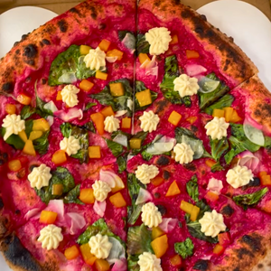 Their menu features traditional options like cheese, margherita, and pepperoni, as well as their signature pizza, The Chonghi. This unique creation features gochujang cream sauce, garlic, mozzarella, provolone, either sausage or tofu crumbles, soy vinaigrette, onions, and togarashi (a Japanese seven-flavor chili blend).